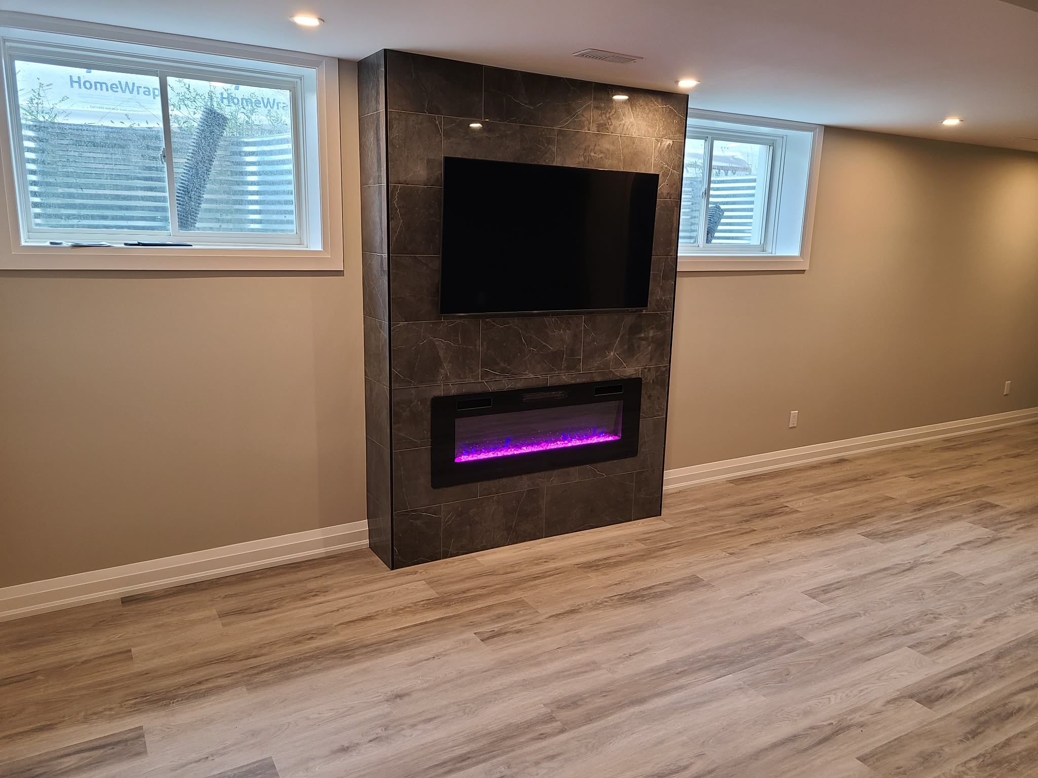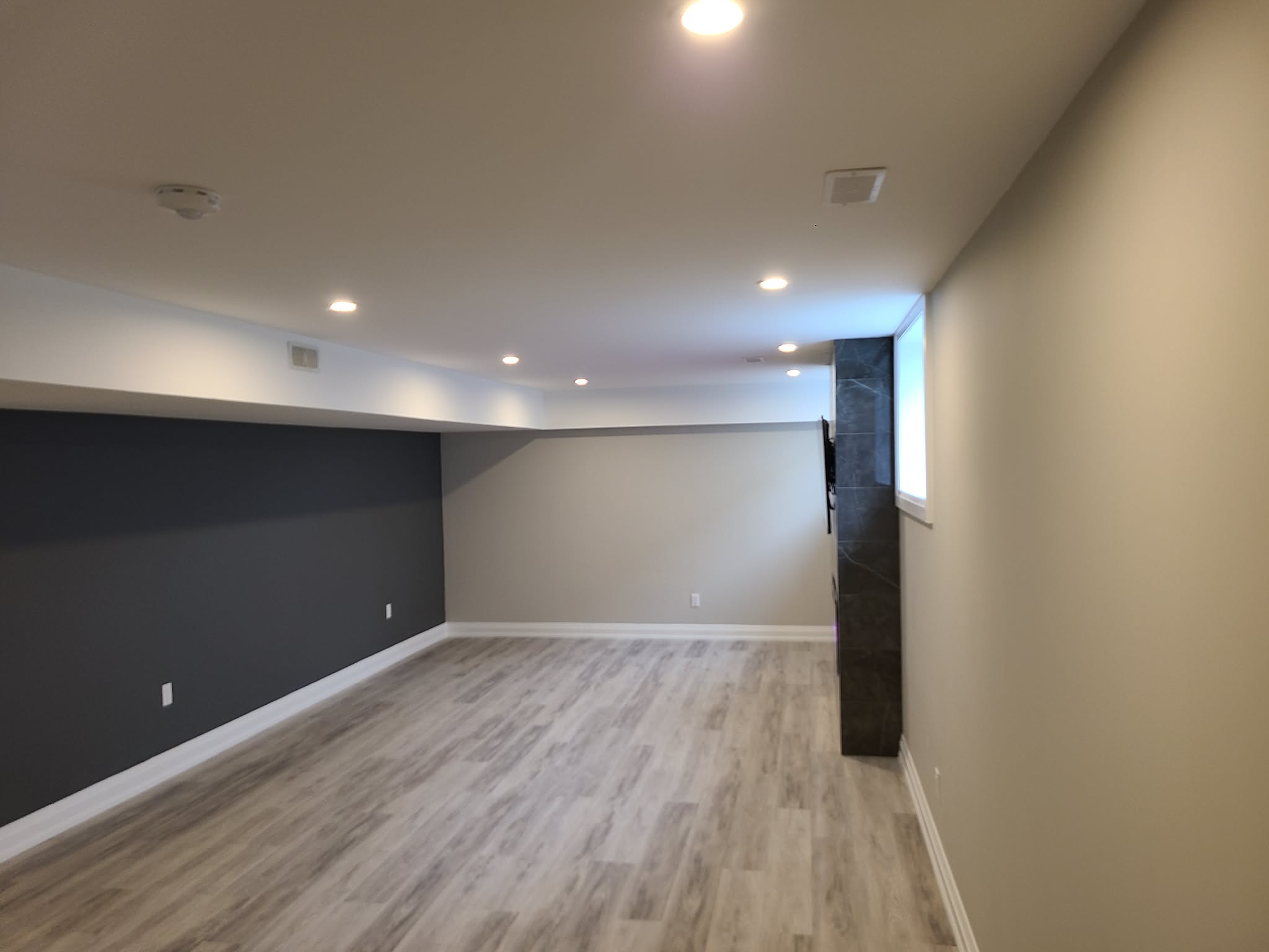 Framing Partition walls , bulkheads , drywall , paint , flooring , tv fireplace mantel, pot lights